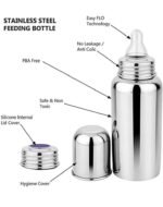 KAKAGUGU Stainless steel feeding bottle with silicone nipple and dust cap for infants & toddlers, non-toxic and 100% safe and durable – 250 ml (Silver)